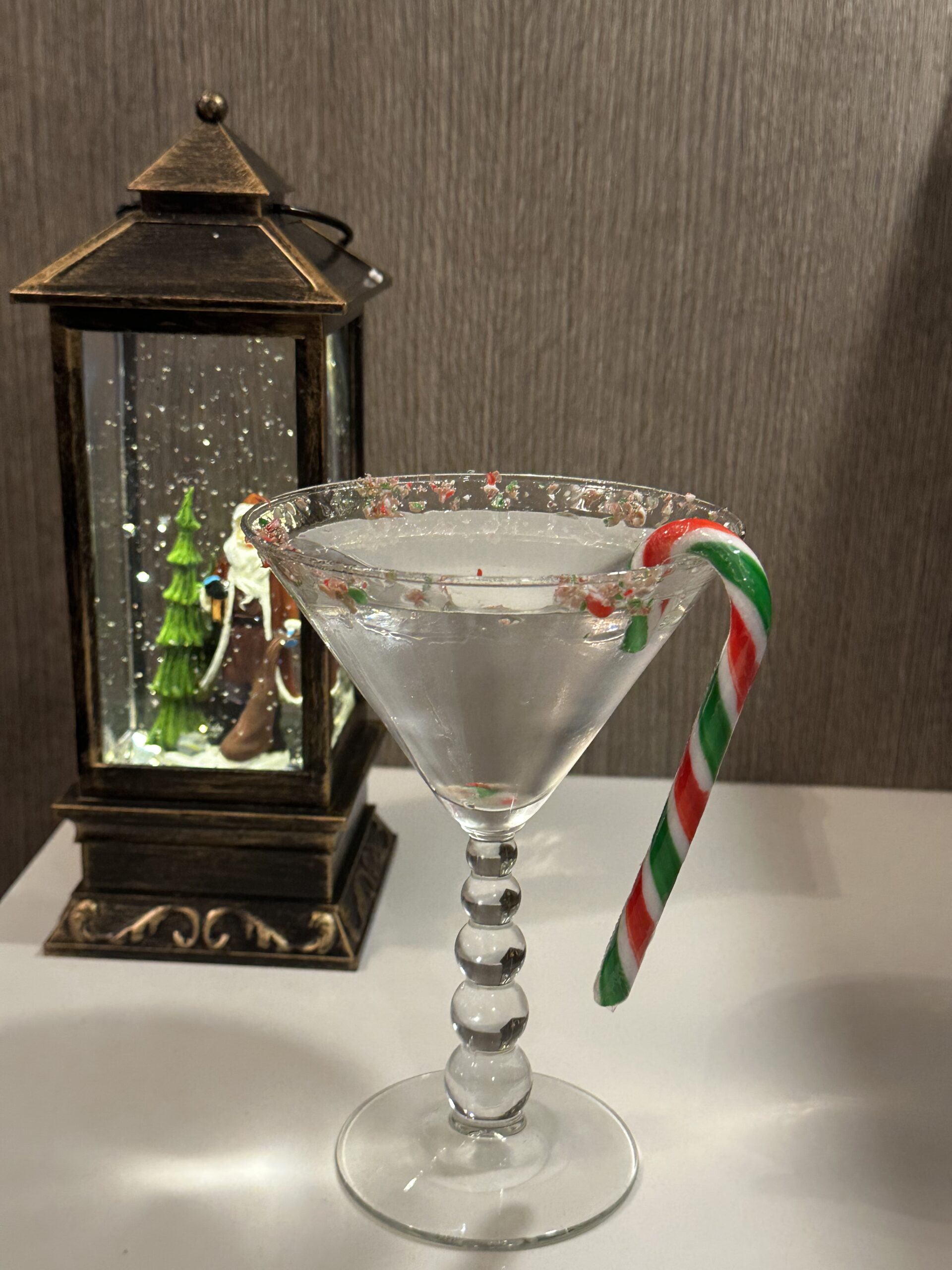Rim a chilled martini glass with crushed candy cane—because subtlety left the room already.